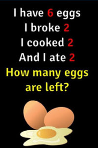 – Grammar rules, the first sentence is in the present tense. So when it says he has 6 eggs, he has 6 eggs. The other sentences are in the past tense. (This is the officially correct answer ….)However:– The exact answer is 2 because if two eggs were broken from 6 eggs there will be 4 more and then she cooked and ate two extra eggs. 6-4=2 so there will be 2 more left– There are four left… he broke two, cooked the same two, and ate the same two.