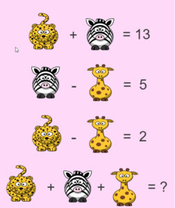 Let’s try 2 – does that work? If we take 2 away from the zebra, it has to equal 5. Can we make the zebra 3 in the first row? Leopard + 3 = 13? that would make the leopard 10.